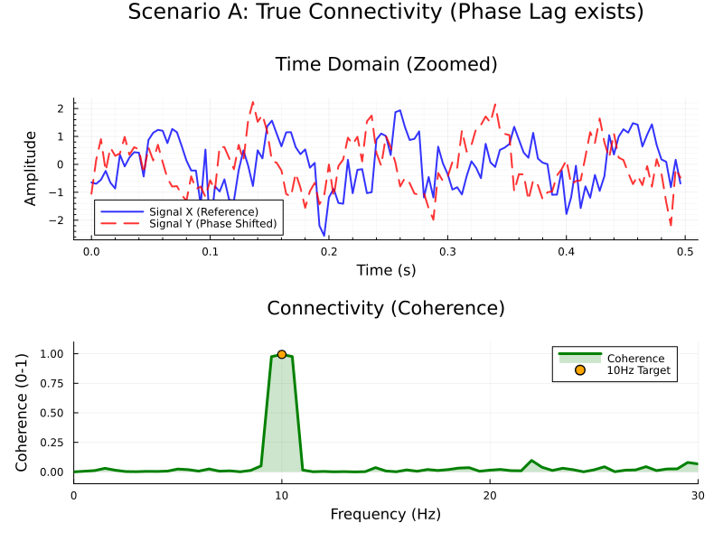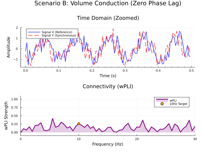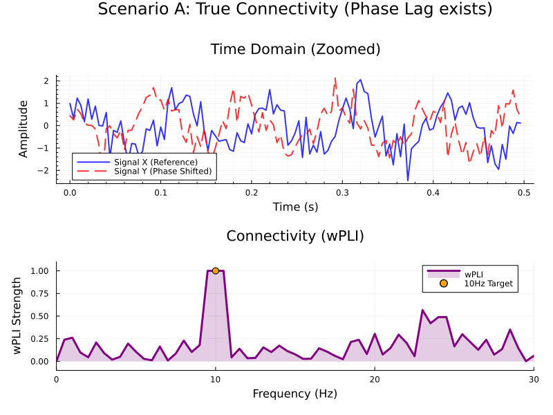 To demonstrate the utility of the wPLI, I simulated two scenarios in Julia. I generated paired signals $X, Y$ representing 50 distinct epochs of 2 seconds each, sampled at 250 Hz. Both signals were constructed based on a shared 10 Hz oscillation modeled as: