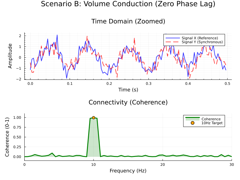 This will serve us to illustrate the false positive problem which arises with volume conduction. The coherence will in fact detect the 10Hz synchronyzation in the phase-lagged scenario, which is correct. However, it will also detected for the zero-lag synchronyzation, which most likely is due to volume conduction. Importantly, there is no way to determine when coherence measures come from volume conduction as opposed to true synchronyzation.